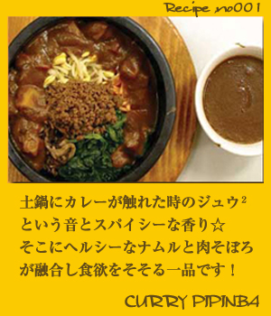 ☆カレーピビンバのレシピ (1人前) ■材料(具材) ■材料(調味料) ・ピビンバセット・・・・・・・・・・・・・1個 ・ごま油・・・・・大さじ1 ・肉そぼろ・・・・・・・・・・・ 約 50グラム ・レトルトカレー・・・・・・・・・・・ 1人前 ・ごはん1人前・・・・・・ ・約 200グラム ■作り方 ・1、石焼鍋(フライパンでも可)をよく熱してからごま油を引きご飯を加える。 ・2、ご飯の上にピビンバセットの材料(コチジャン以外)と味付けした肉そぼろをのせる ・3、温めたレトルトのカレーを加えて完成。 ・そぼろですが味付けは醤油、みりんでほんのり甘くなる程度でOK! 味付けが濃いとカレーの濃い味と喧嘩してくどくなります(>_<) |