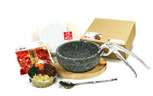 【石焼きピビンバセット】 - - - - - - - - - - - 価格3500円 (1セット) TV番組で『おいしい!』と絶賛頂きました。セラミック製の石鍋にご飯と具材を盛ったら、コンロに乗せて焼くこと5分で完成!おこげと一緒に食べれば最高です! |