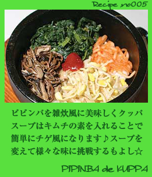 ☆ピビンバdeクッパ (1人前) ■材料(具材) ■材料(調味料) ・ごはん・・・・・・・・・・・・・・・ 1杯 ・鶏ガラスープ・・・・・・・・・・・・・茶碗1杯分 ・ピビンバセット・・・・・・・・・ 1個 ・キムチの素・・・・・・・・・・・・・・・・・・・ 適量 ■作り方 ・1、よそったごはんに材料のナムルを盛り付ける。。 ・2、鶏がらスープに(コンソメスープでも何でも可)キムチの素を適量加えて混ぜる。 ・3、”2”を”1”にかければ完成。 ・キムチチゲ・テールスープ・カルビスープ・牛骨スープ・鶏スープ・どじょう汁(ヤンニョム 付き)・韓国鍋風だしの計7種。7通りのクッパを試されるのもよいかと存じます☆ |