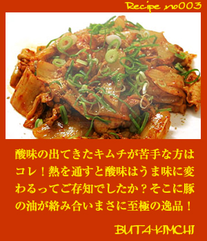 ☆王道!豚キムチ (2人前) ■材料(具材) ■材料(調味料) ・豚バラ肉・・・・・・・・・・・・・ 120グラム ・ごま油・・・・・・・・・・・・・・・・大さじ2 ・甘辛白菜キムチ・・・ ・・・・350グラム ・だし醤油・・・・・・・・・・・・・・大さじ1 ・ネギ(1/2束)・・・・・・・・・・・20グラム ・胡椒・・・・・・・・・・・・・・・・適量 ・すりごま・・・・・・・・・・・・・・・・・・・適量 ■作り方 ・1、キムチを約3センチに切り、豚バラ肉は一口大に切ります。 ・2、熱したフライパンにごま油を入れ豚肉を炒めます。 ・3、だし醤油を大さじ1入れ、胡椒も少々入れます。 ・4、キムチを加え混ぜながら強火で豪快に炒めていきます。 ・5、汁が蒸発しすぎない程度で火を止め、ネギとすりごまをまぶし完成です☆ ・汁を捨てるのは厳禁!なぜならあの汁にこそ乳酸菌が豊富に含まれているため |