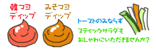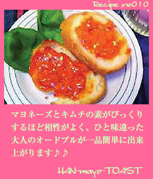 ☆韓mayoトースト (4人前) ■材料 ■材料(調味料) ・フランスパン・・・・・・・・・・・・・・1/2本 ・キムチの素・・・・・・・・・・・・・・・大さじ3 ・マヨネーズ・・・・・・・・・・・・・・・・大さじ4 ■作り方 ・1、フランスパンをお好みの厚さに切る。(食パンでも可) ・2、キムチの素とマヨネーズを混ぜ合わせ、カットしたフランスパンにお好みの量を たっぷりと塗ります。 ・3、トースターでこんがり焼き色が付くまで焼いて出来上がり。 ・キムチの素の赤だけでは見栄えも楽しくないな~と思うあなたにはこちらを! サンチュ味噌とマヨネーズをよく混ぜてもう一種のソースを作りましょう。 優しいオレンジのようなピーナツバターのような色の「みそマヨ」ディップ完成☆ |